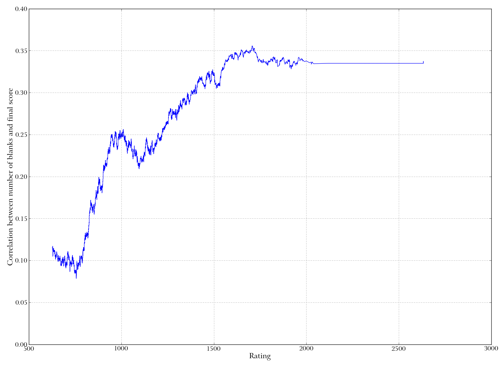 Correlation between number of blanks and final game score, calculated in a moving window by player rating. The correlation increases with higher rank, indicating that for better players, the luck of getting a blank matters more.