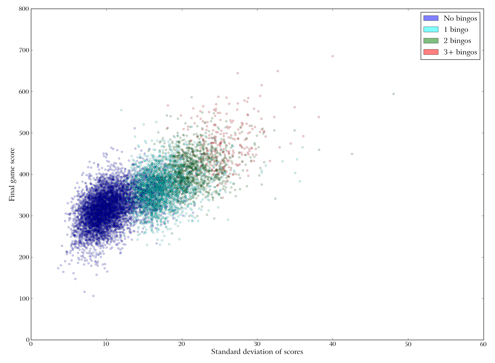 Standard deviation of individual play scores versus final game scores. Each dot represents one player. Dots are colored according to the number of bingos played in the game. It is clear that high standard deviations are largely achieved by playing more bingos.