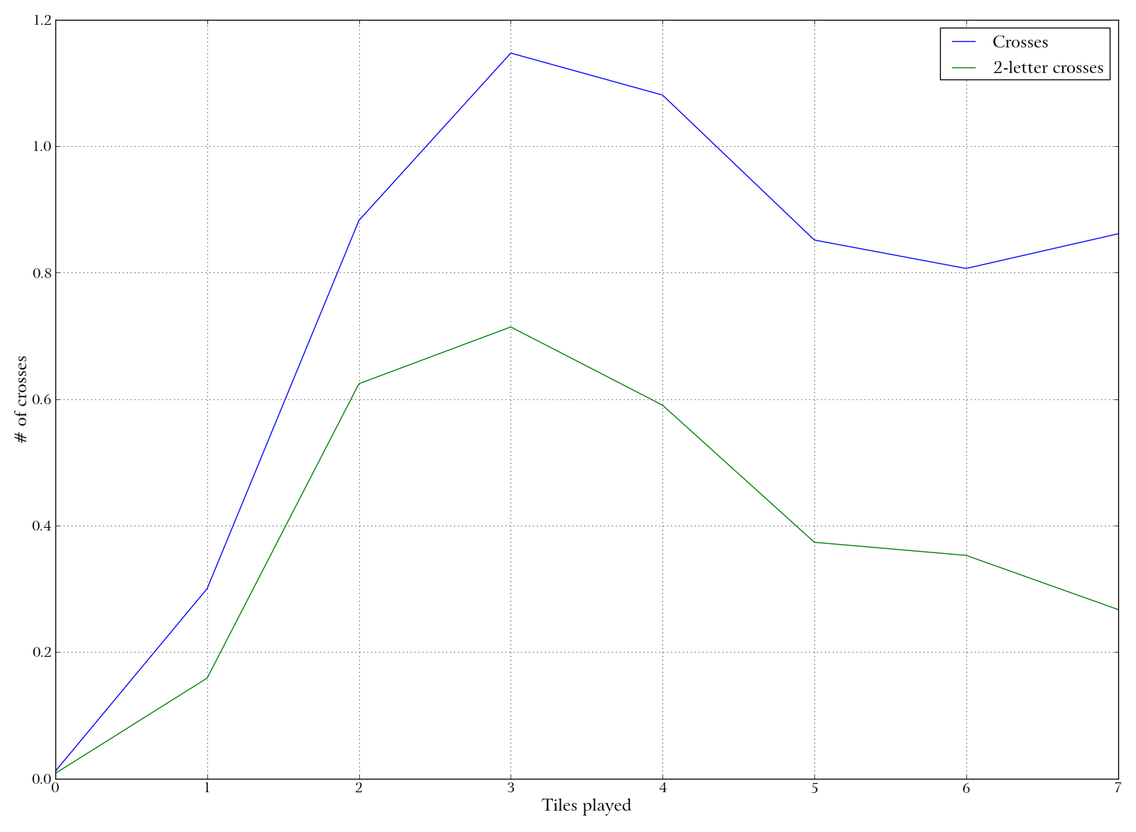 Tiles played versus number of crosses (that is, connecting with words perpendicular to the main word to make “crosswords”). Number of crosses is highest for mid-length plays, meaning that players who play the longest words on average will tend to have fewer crosses.