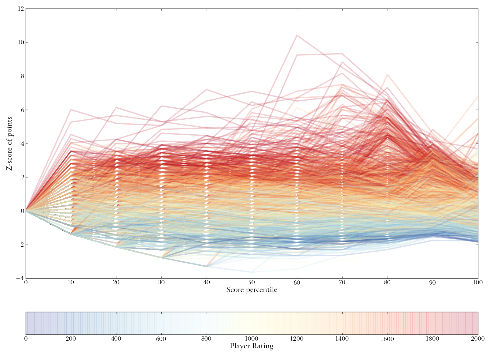 Z-scores of plays at various percentiles. Each line represents one player, with the color of the line representing the player’s rank. X-axis represents percentile (e.g., “40” means the score at each player’s 40th percentile). Y-axis is in z-scores normalized to the overall mean at each percentile. The large jump at 80th percentile, and smaller jump at 90th percentile, indicate that what differentiates good players is their ability to make more super-high-scoring plays (i.e., bingos).